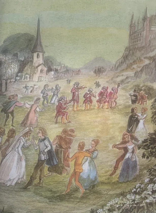 Violetta also represents Sophia (Divine Wisdom from the bible). The Book of Proverbs pictures Sophia dancing on the circle of the world before the face of God.7 That “Great Dance” shows up in C.S. Lewis (Aslan singing Narnia into being) and Tolkien (the Ainulindalë, the music of the Ainur).8 Etymologically, to “en-chant” is literally to sing into existence. When the Trumpet is lost, the song stops and we’re left with dead matter. When it’s found, the music resumes and the world lives again.